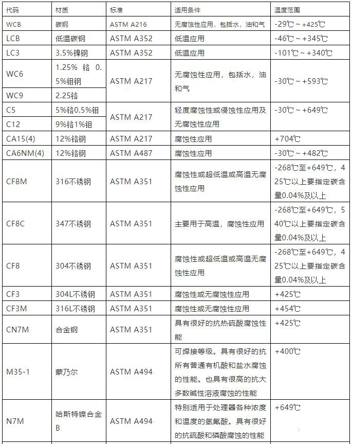 閥體常用材質表,適用溫度,介質,壓力一覽表! 2020-05-210 工況因為介質、溫度和壓力不同,導致閥體需要的材質不同,很多人不清楚,小編特此為大家整理。相關知識:機械密封專題 水泵選型專題 上一篇自平衡多級泵D、DG、DF、MD(P)155-67參數_性能曲線圖_性能表_中聯(lián)泵業(yè) 下一篇工業(yè)自吸泵選型對比 相關文章 工業(yè)自吸泵選型對比 潛水泵不上水什么原因?(廠家整理) 冬季水泵的維修與養(yǎng)護(防止水泵結冰現(xiàn)象的六個方法)? 格蘭富水泵官網-哪個是正錯的,別搞錯了! 機械密封彈簧壓縮量調試時有哪些要求? 靜環(huán)組件安裝時有哪些注意事項? 機械密封裝配后的檢查有哪些要求? 動密封泄漏點的檢驗標準是什么? 壓蘭填料的填充時有哪些要求? 機械安裝填料前應做哪些準備工作?