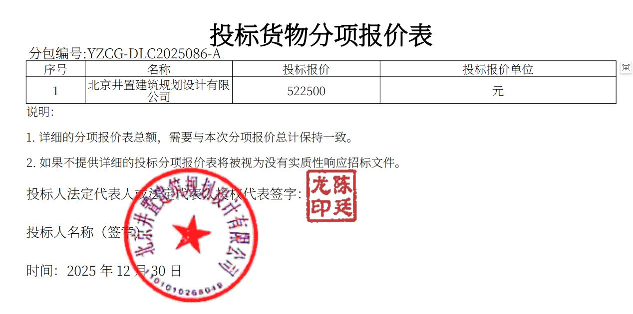 YZCG-DLC2025086 | 禹州市住房和城鄉(xiāng)建設(shè)局禹州市傳統(tǒng)村落數(shù)字化建設(shè)項(xiàng)目 | 北京井置建筑規(guī)劃設(shè)計(jì)有限公司 | 北京市朝陽區(qū)慧忠北里222號樓-3至15層101號5層0520 | 522500.00 | 元 | 評審總得分:88分 | ||