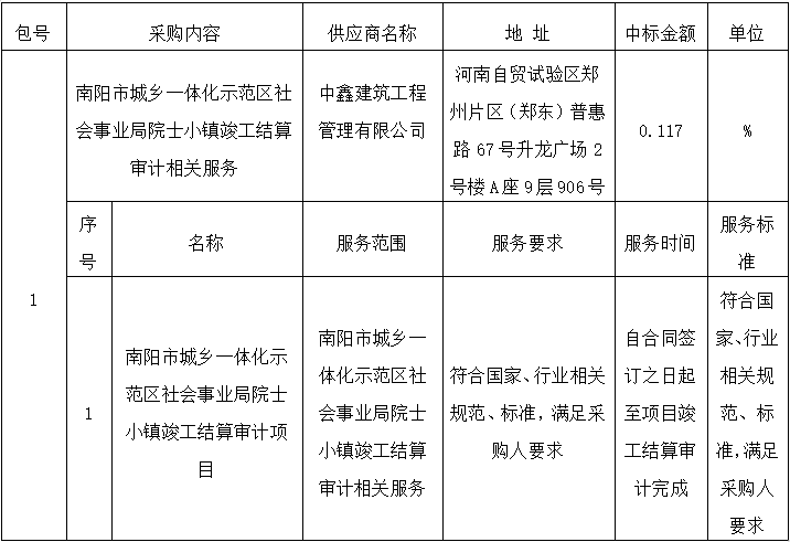 南陽市城鄉一體化示范區社會事業局院士小鎮竣工結算審計項目成交公告